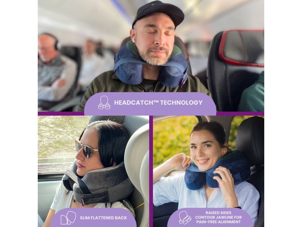 Die Form des Kissens passt sich Ihrem Kopf und Nacken an. Die seitlichen Bereiche bieten Unterstützung, während die Rückseite abgeflacht ist, um bequem z. B. an einem Flugzeugsitz anzulehnen.